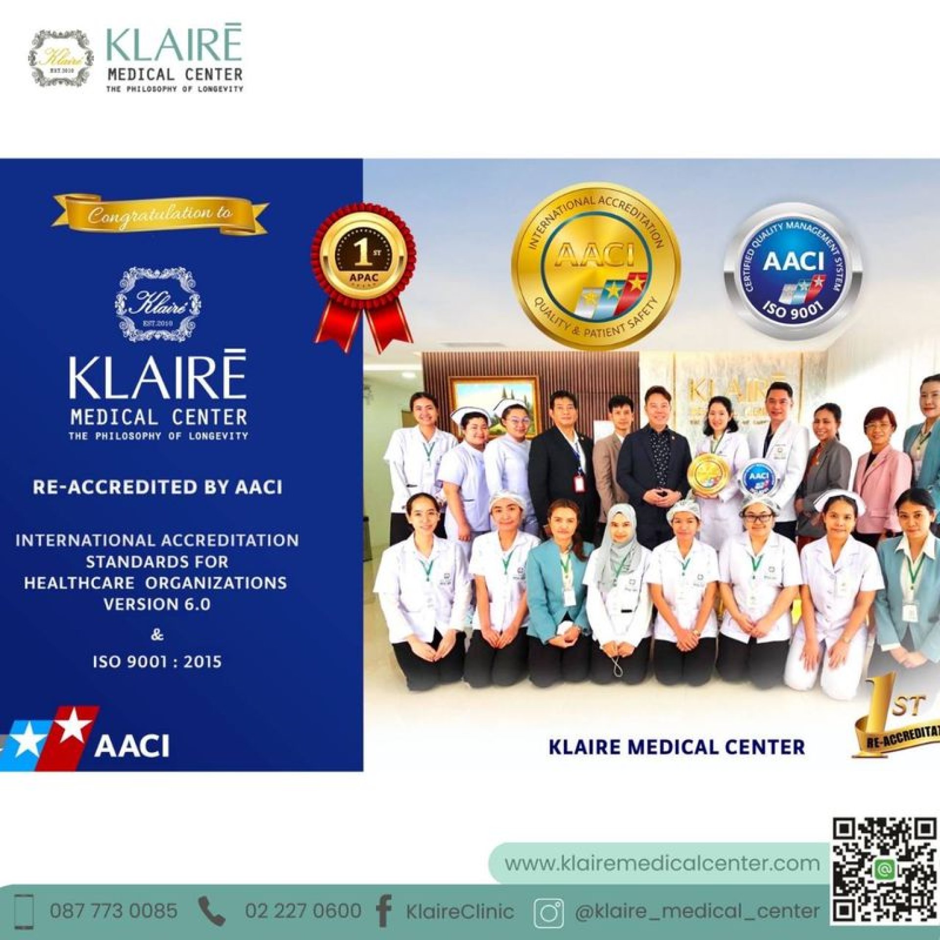 แคลร์เมดิคอลเซ็นเตอร์ ได้รับการต่ออายุการรับรองมาตรฐานระดับสากลจาก AACI (American Accreditation Commission International) และ ISO 9001 เป็นแห่งแรกของประเทศไทย